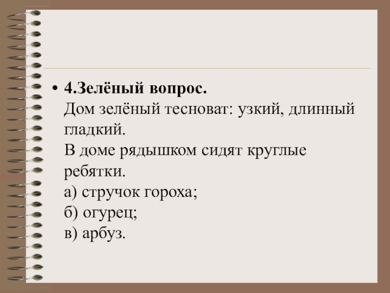 4.Зелёный вопрос.  Дом зелёный тесноват: узкий, длинный гладкий.  В доме рядышком сидят круглые ребятки.  а) стручок гороха;