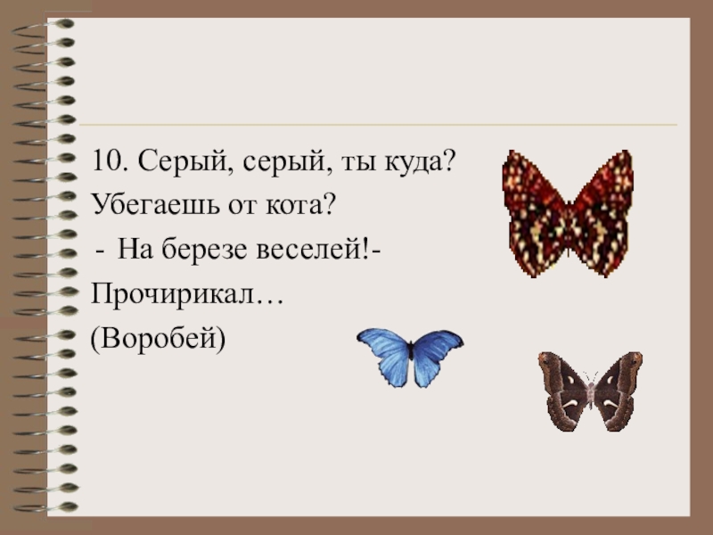 10. Серый, серый, ты куда?Убегаешь от кота?На березе веселей!-Прочирикал… (Воробей)