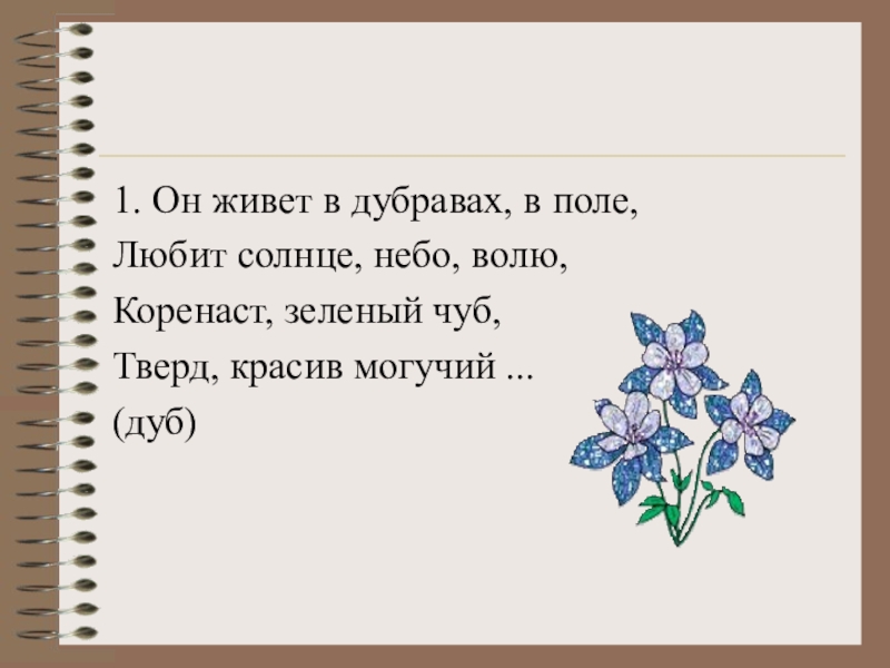 1. Он живет в дубравах, в поле,Любит солнце, небо, волю,Коренаст, зеленый чуб,Тверд, красив могучий ...(дуб)
