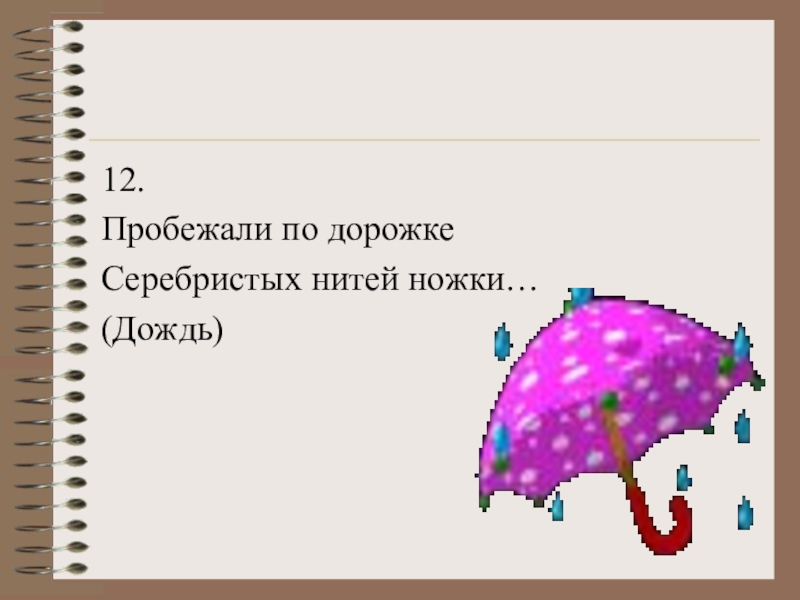 12.Пробежали по дорожкеСеребристых нитей ножки…(Дождь)