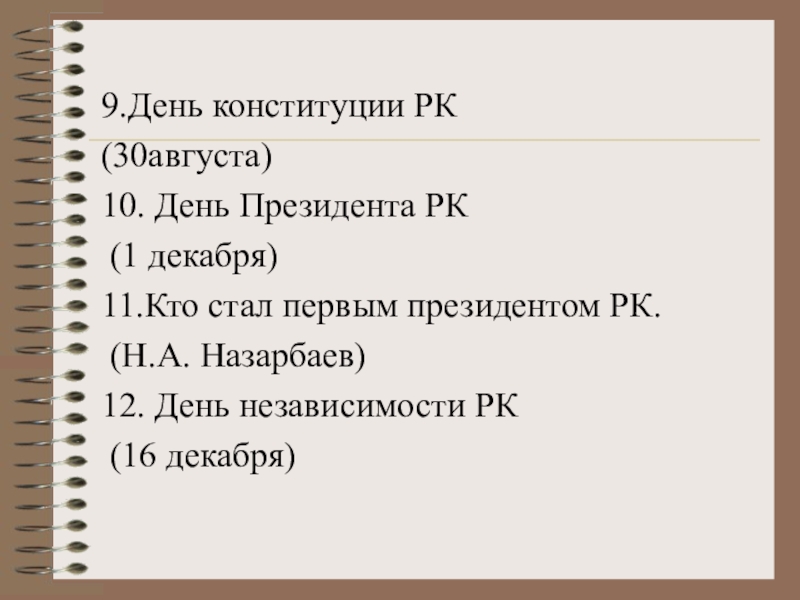 9.День конституции РК(30августа) 10. День Президента РК (1 декабря) 11.Кто стал первым президентом РК. (Н.А. Назарбаев)12. День независимости