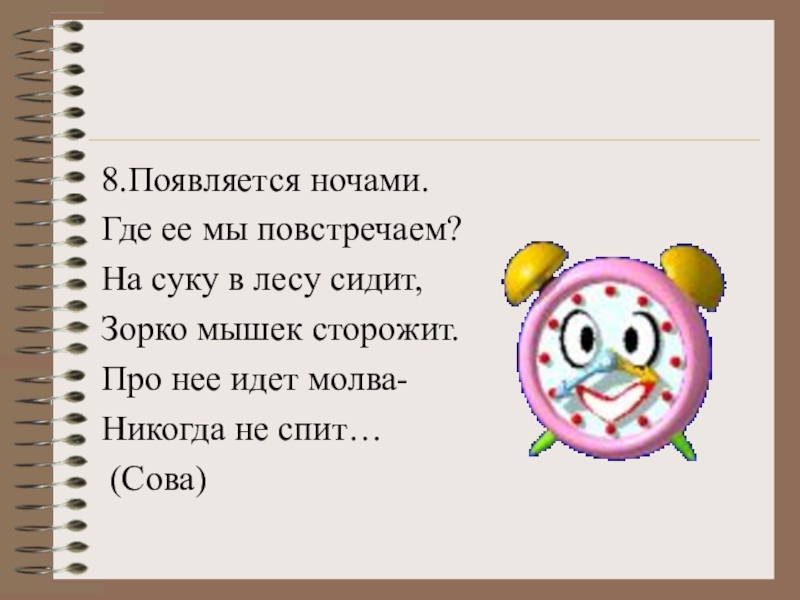 8.Появляется ночами.Где ее мы повстречаем?На суку в лесу сидит,Зорко мышек сторожит.Про нее идет молва-Никогда не спит… (Сова)