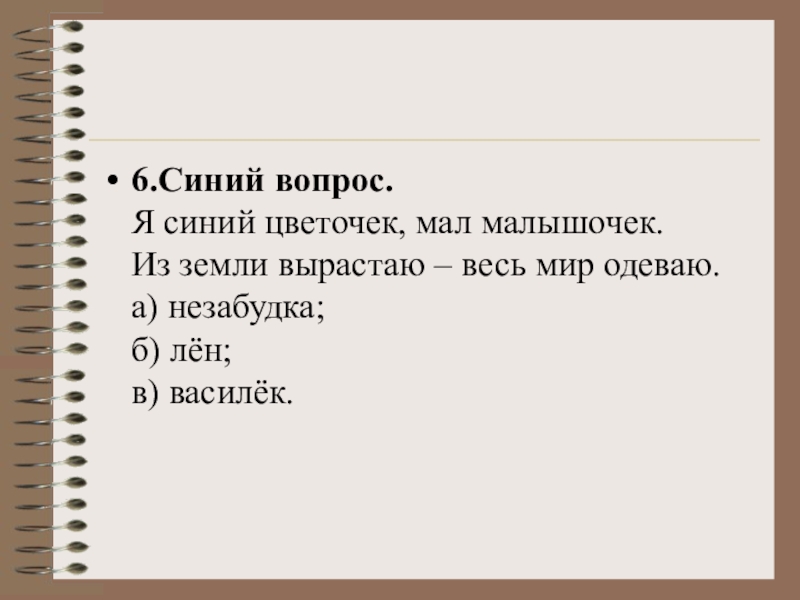 6.Синий вопрос.  Я синий цветочек, мал малышочек.  Из земли вырастаю – весь мир одеваю.  а) незабудка;  б)