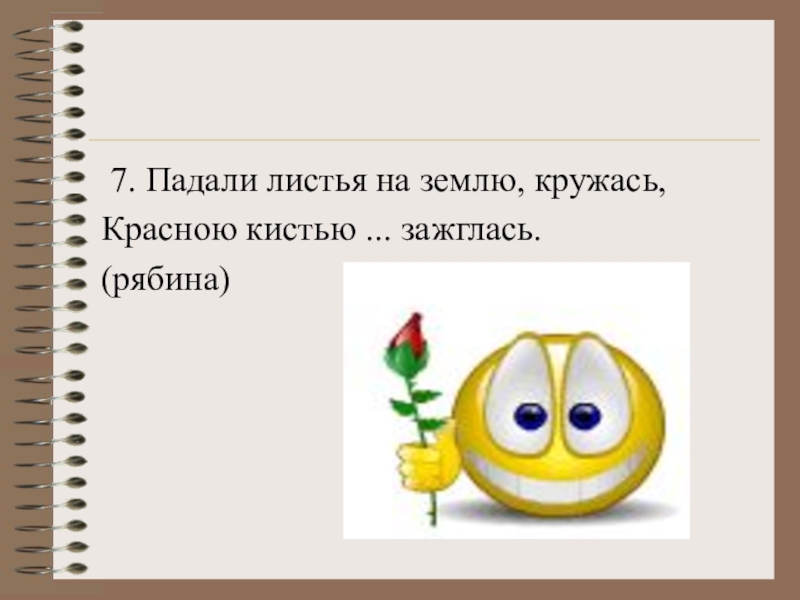 7. Падали листья на землю, кружась, Красною кистью ... зажглась.(рябина)