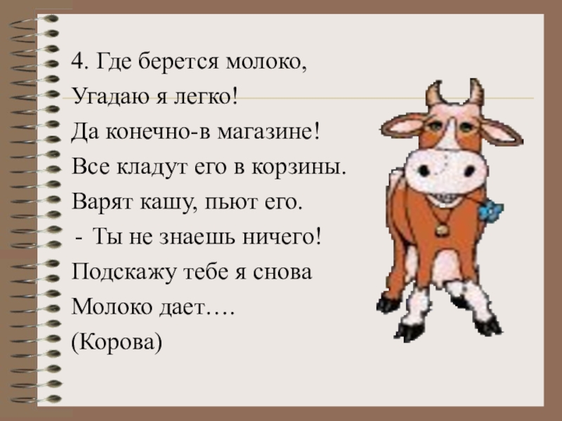4. Где берется молоко,Угадаю я легко!Да конечно-в магазине!Все кладут его в корзины.Варят кашу, пьют его.Ты не знаешь