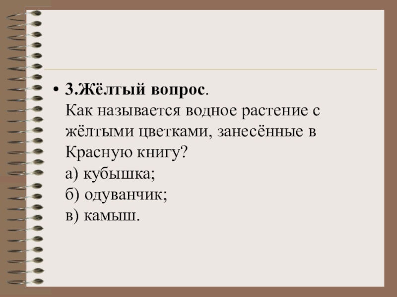 3.Жёлтый вопрос.  Как называется водное растение с жёлтыми цветками, занесённые в Красную книгу?  а) кубышка;  б) одуванчик;