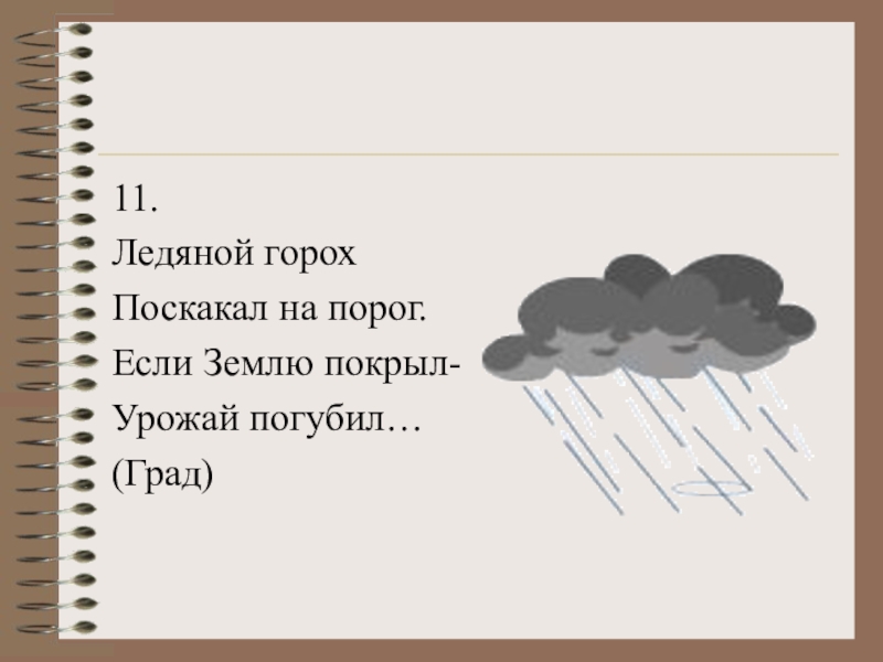 11.Ледяной горохПоскакал на порог.Если Землю покрыл-Урожай погубил…(Град)