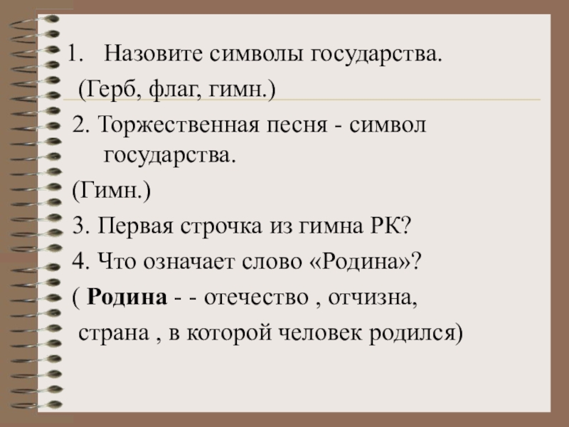 Назовите символы государства. (Герб, флаг, гимн.) 2. Торжественная песня - символ государства. (Гимн.) 3. Первая строчка из гимна РК?