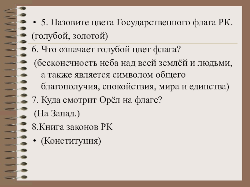 5. Назовите цвета Государственного флага РК. (голубой, золотой) 6. Что означает голубой цвет флага? (бесконечность неба над всей землёй