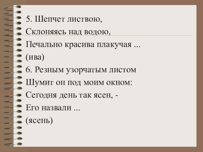5. Шепчет листвою, Склоняясь над водою, Печально красива плакучая ...(ива)6. Резным узорчатым листом Шумит он под моим