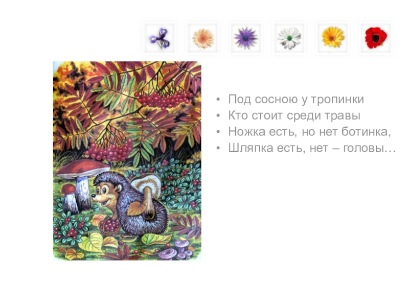 Под сосною у тропинкиКто стоит среди травыНожка есть, но нет ботинка,Шляпка есть, нет – головы…