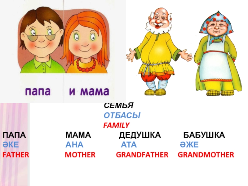 СЕМЬЯ ОТБАСЫ FAMILY ПАПА МАМА ДЕДУШКА БАБУШКА ӘКЕ АНА АТА ӘЖЕ FATHER MOTHER GRANDFATHER GRANDMOTHER