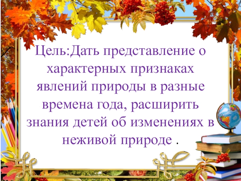 Слайд 2Цель:Дать представление о характерных признаках явлений природы в разные времена года,