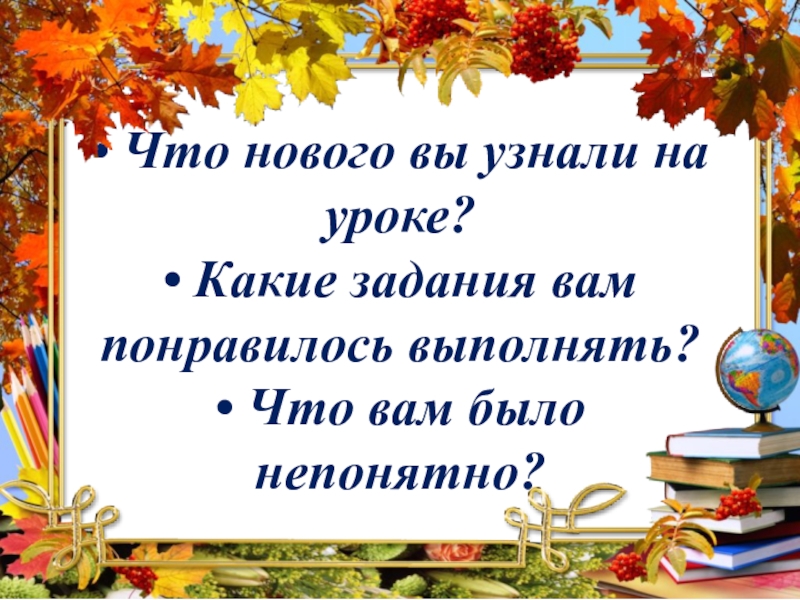 • Что нового вы узнали на уроке? • Какие задания вам понравилось выполнять? • Что вам было
