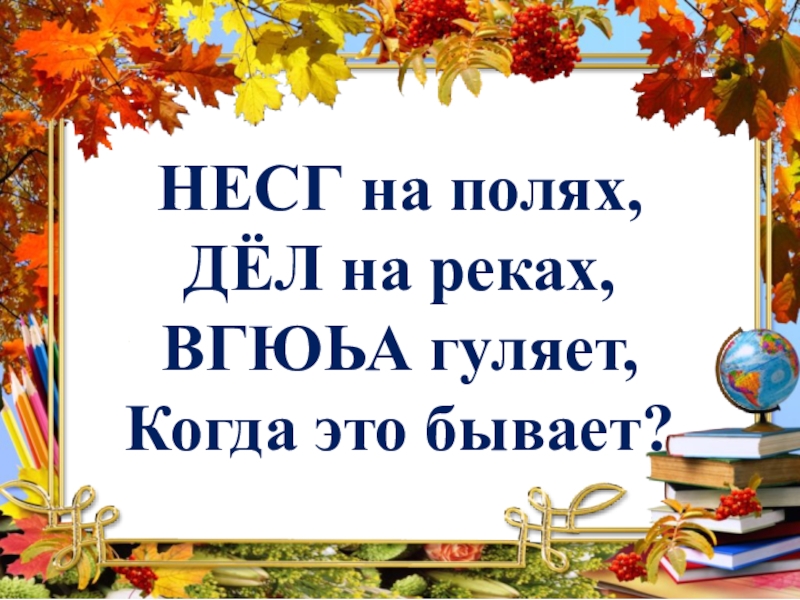 Слайд 4НЕСГ на полях, ДЁЛ на реках, ВГЮЬА гуляет, Когда это бывает?