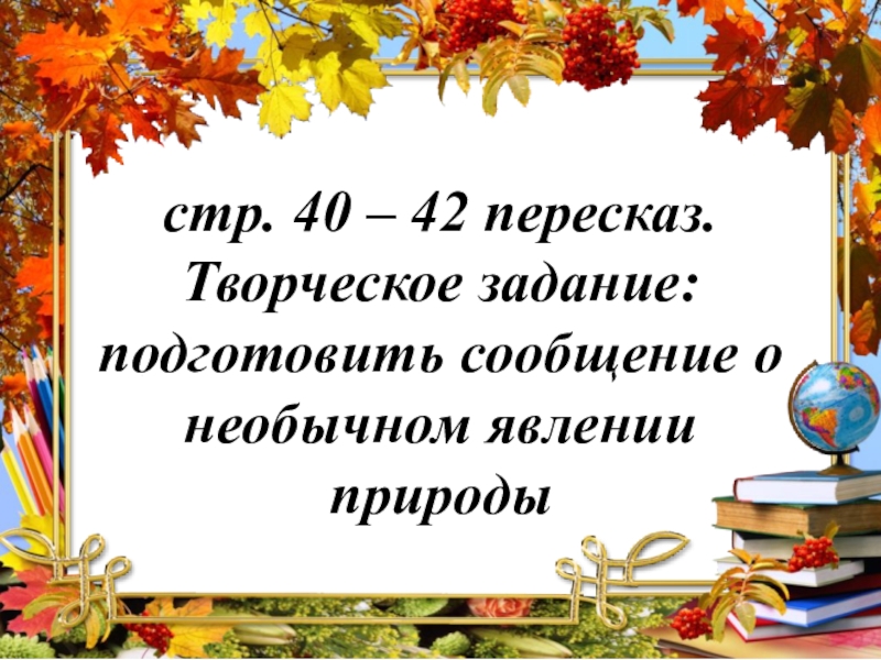 стр. 40 – 42 пересказ. Творческое задание: подготовить сообщение о необычном явлении природы
