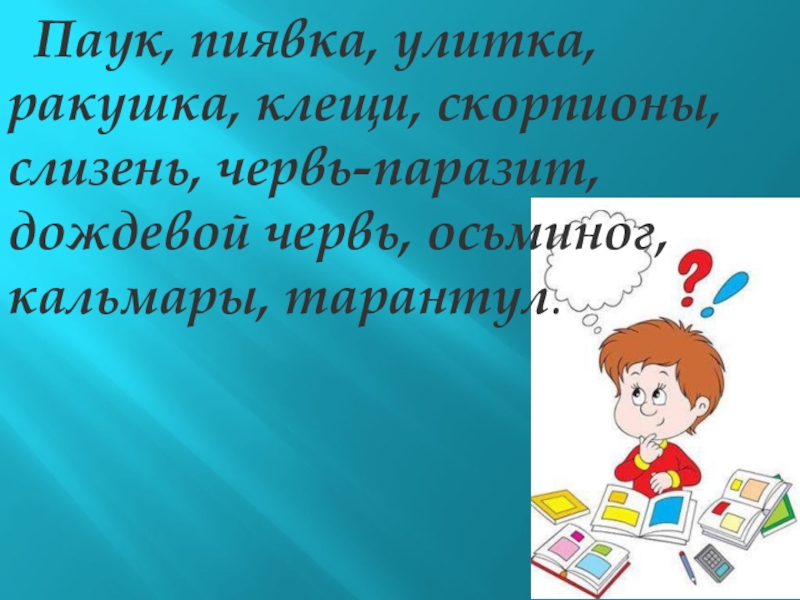 Слайд 19 Паук, пиявка, улитка, ракушка, клещи, скорпионы, слизень, червь-паразит, дождевой червь,
