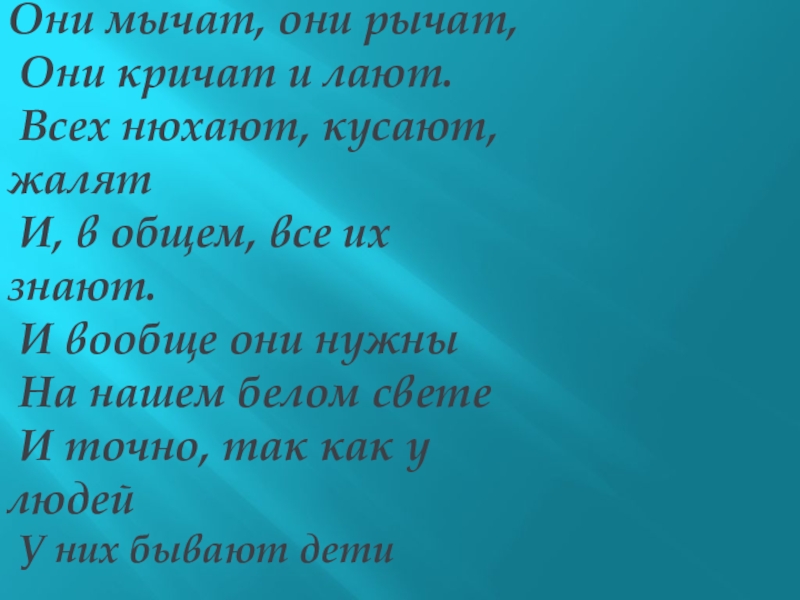 Они мычат, они рычат, Они кричат и лают. Всех нюхают, кусают, жалят И, в общем, все их знают. И вообще они