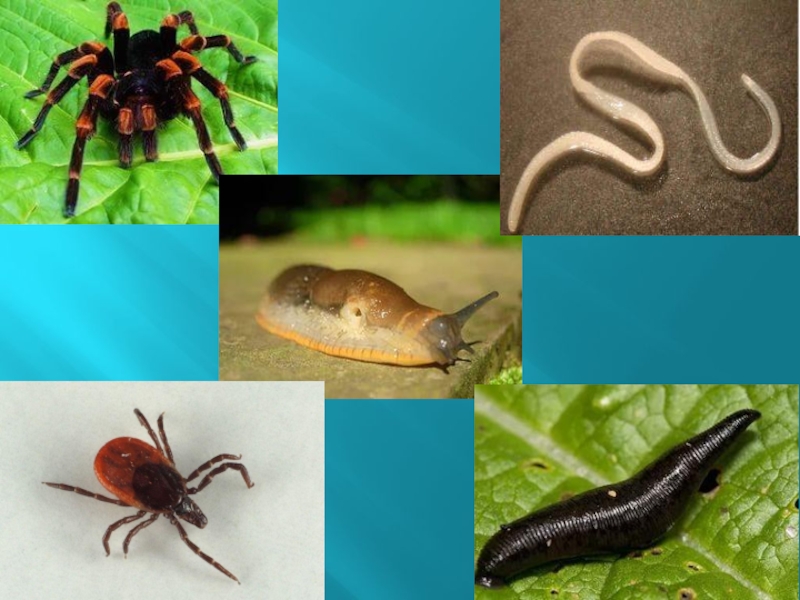 Паук, пиявка, улитка, ракушка, клещи, скорпионы, слизень, червь-паразит, дождевой червь, осьминог, кальмары, тарантул.