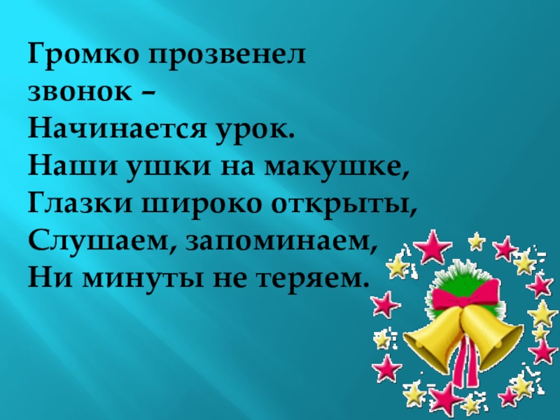 Слайд 2Громко прозвенел звонок – Начинается урок. Наши ушки на макушке, Глазки широко открыты, Слушаем, запоминаем, Ни