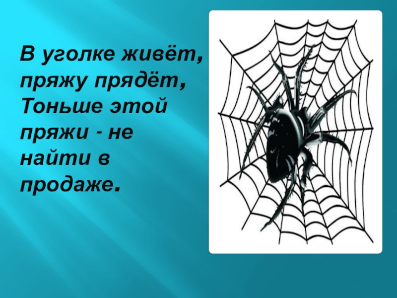Слайд 16В уголке живёт, пряжу прядёт, Тоньше этой пряжи - не найти в