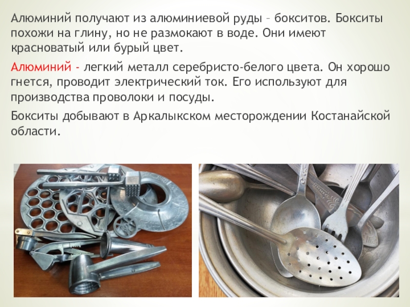 Алюминий - легкий металл серебристо-белого цвета. Он хорошо гнется, проводит электрический ток. Его используют для производства проволоки и посуды.