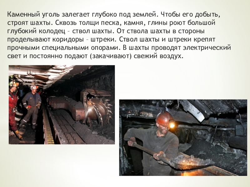 Слайд 7Каменный уголь залегает глубоко под землей. Чтобы его добыть, строят шахты.
