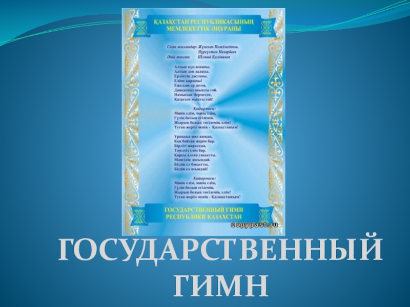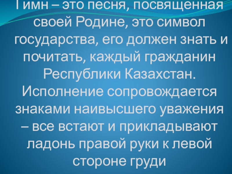 должен знать и почитать, каждый гражданин Республики Казахстан. Исполнение сопровождается знаками наивысшего уважения – все встают и прикладывают ладонь правой руки к левой стороне груди
