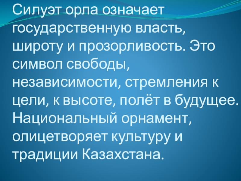 Слайд 10Силуэт орла означает государственную власть, широту и прозорливость. Это символ свободы,