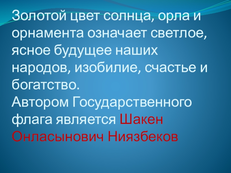 Слайд 12Золотой цвет солнца, орла и орнамента означает светлое, ясное будущее наших