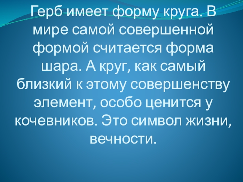 Слайд 14Герб имеет форму круга. В мире самой совершенной формой считается форма