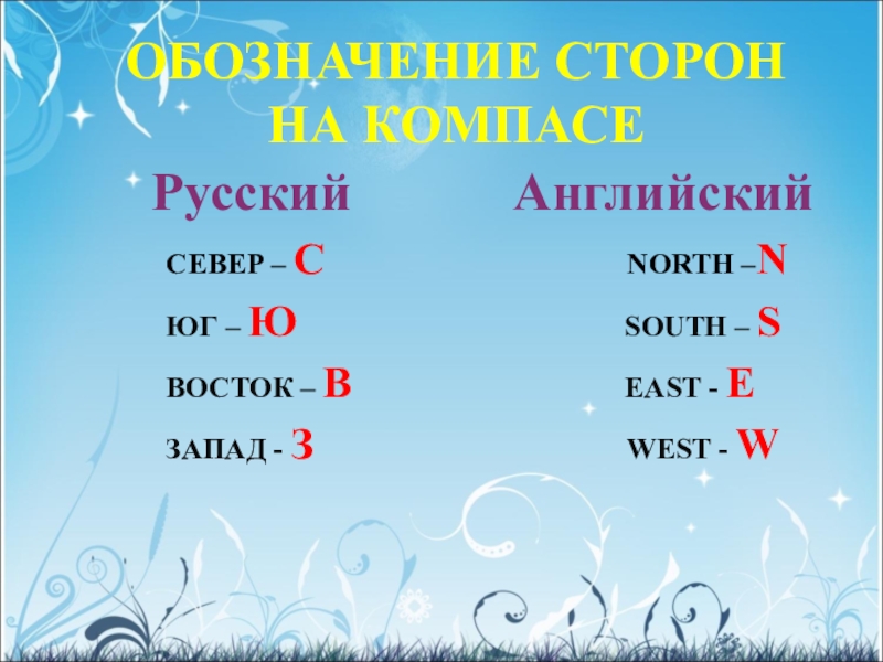 ОБОЗНАЧЕНИЕ СТОРОН  НА КОМПАСЕ      Русский      Английский