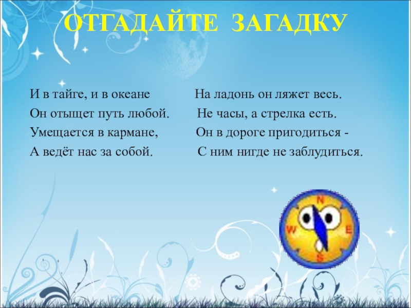 ОТГАДАЙТЕ ЗАГАДКУИ в тайге, и в океане           На ладонь он ляжет весь.Он отыщет путь любой.        Не
