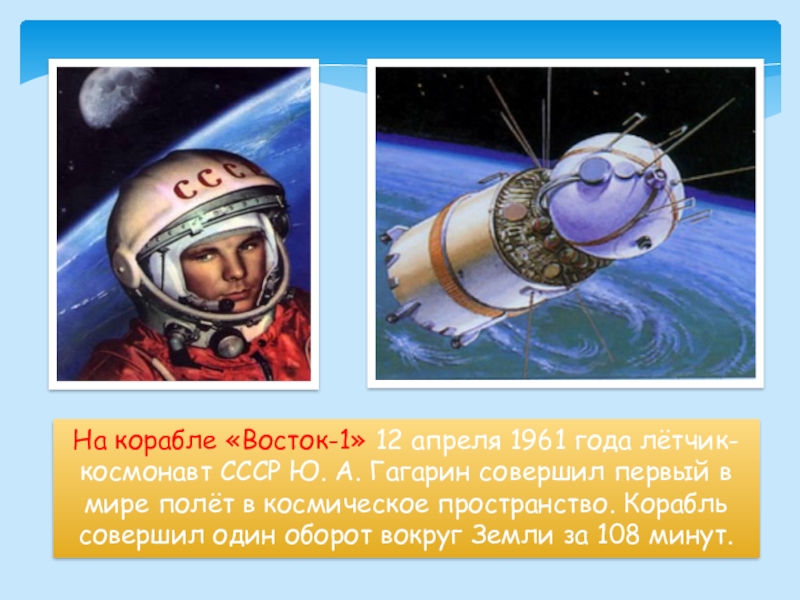 Гагарин совершил первый в мире полёт в космическое пространство. Корабль совершил один оборот вокруг Земли за 108 минут.