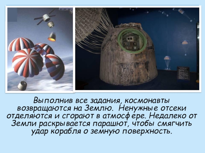 Слайд 25Выполнив все задания, космонавты возвращаются на Землю. Ненужные отсеки отделяются и