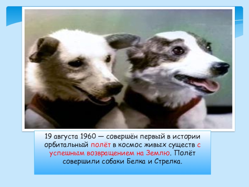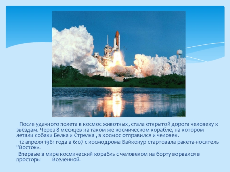 открытой дорога человеку к звёздам. Через 8 месяцев на таком же космическом корабле, на котором летали собаки Белка и Стрелка , в космос отправился и человек.