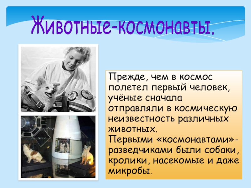 Слайд 5Прежде, чем в космос полетел первый человек, учёные сначала отправляли в