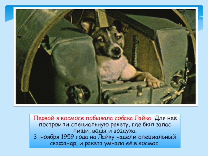 Слайд 6Первой в космосе побывала собака Лайка. Для неё построили специальную ракету,