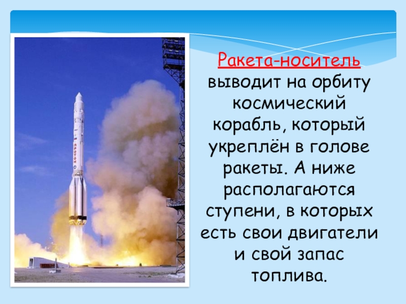 Слайд 18Ракета-носитель выводит на орбиту космический корабль, который укреплён в голове ракеты.