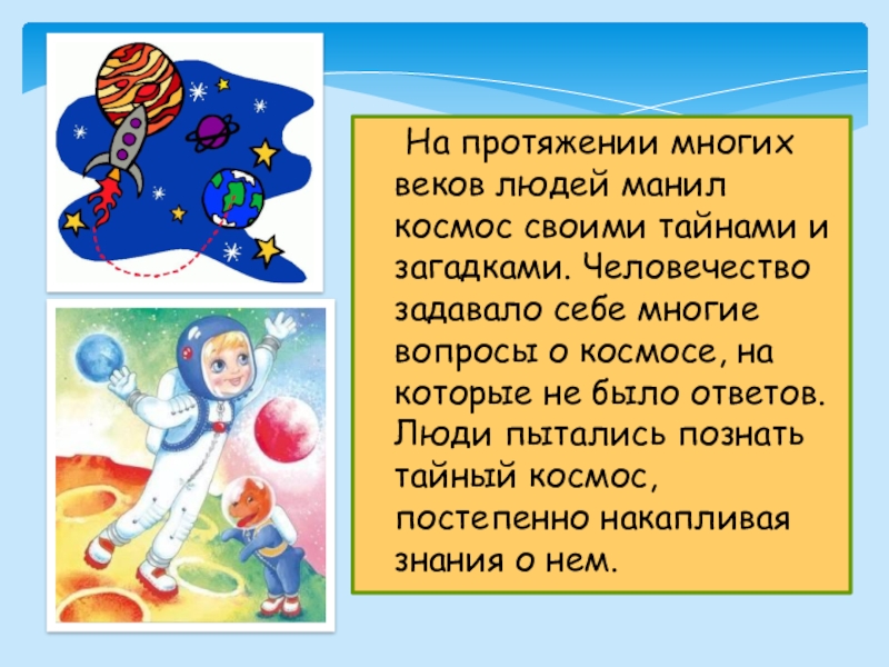 Слайд 3 На протяжении многих веков людей манил космос своими тайнами и загадками.