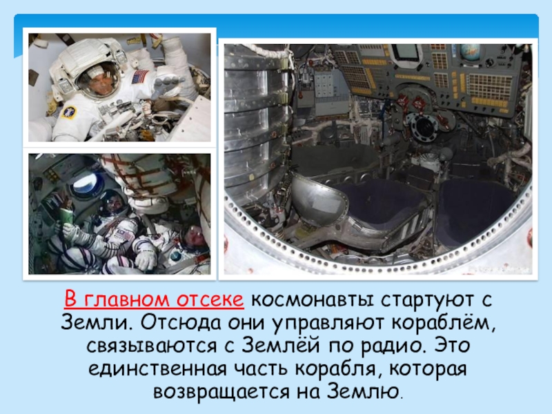 Слайд 20В главном отсеке космонавты стартуют с Земли. Отсюда они управляют кораблём,