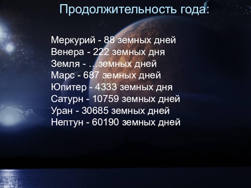 Продолжительность года:Меркурий - 88 земных днейВенера - 222 земных дня Земля - …земных днейМарс - 687 земных
