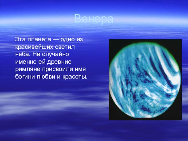 Венера  Эта планета — одно из красивейших светил неба. Не случайно именно ей древние римляне присвоили