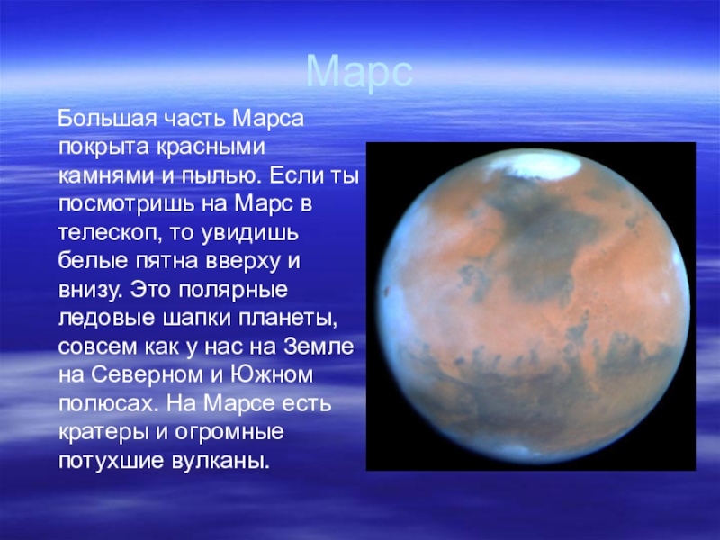 ты посмотришь на Марс в телескоп, то увидишь белые пятна вверху и внизу. Это полярные ледовые шапки планеты, совсем как у нас на Земле на Северном и Южном полюсах. На Марсе есть кратеры и огромные потухшие вулканы.