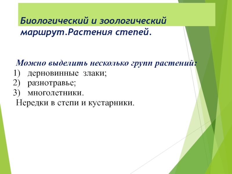4. Пустынная степь. Самый сухой вариант степи. Растительность низкорослая (5-8 см). Крупные злаки или кустарники имеют большую корневую систему, уходящую на несколько метров вглубь.