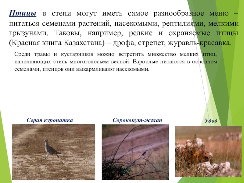 Птицы в степи могут иметь самое разнообразное меню – питаться семенами растений, насекомыми, рептилиями, мелкими грызунами. Таковы, например, редкие и охраняемые птицы (Красная книга Казахстана) – дрофа, стрепет, журавль-красавка.