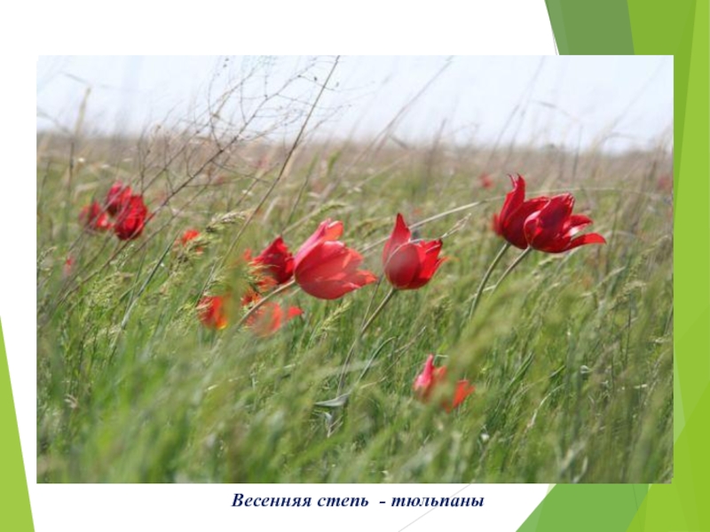 2. Типичная степь. Здесь много разнотравья, но их жизнедеятельность заканчивается в конце июня. Растительный покров бывает высотой не более 0,5 м.
