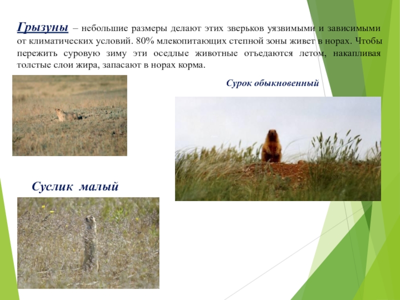 Средние – степной хорь, барсук, ёж, степная гадюка, прыткая и зеленые ящерицы.