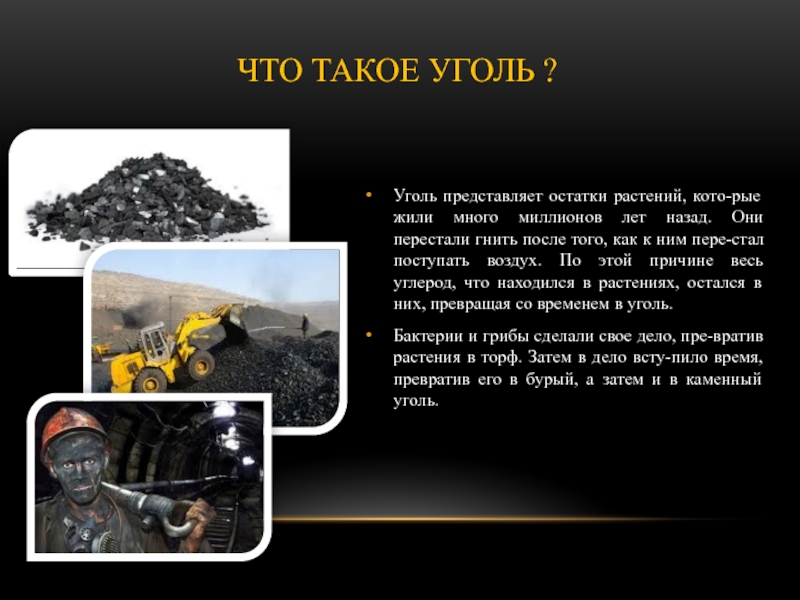 Уголь представляет остатки растений, кото-рые жили много миллионов