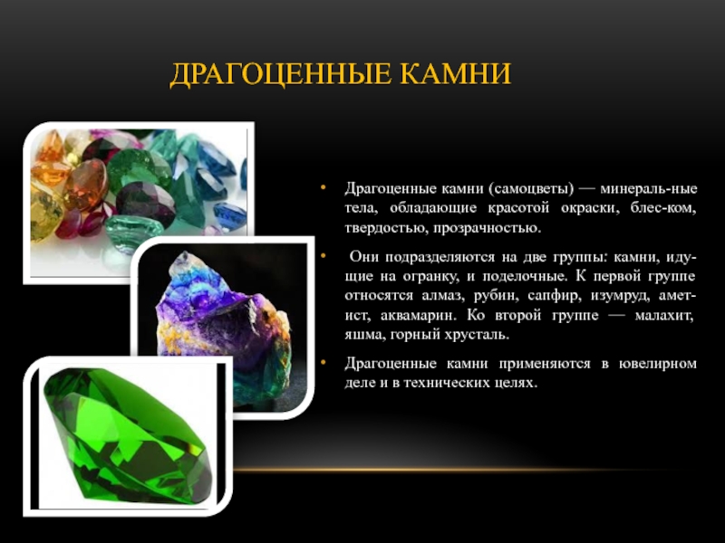 Они подразделяются на две группы: камни, иду-щие на огранку, и поделочные. К первой группе относятся алмаз, рубин, сапфир, изумруд, амет-ист, аквамарин. Ко второй группе — малахит, яшма, горный хрусталь.